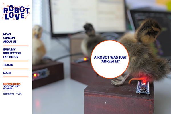 Among robots we do not only include the humanoid robots where the largest gains are made in terms of popularity (the first baby robot is already born). The development of artificial intelligence (AI), and the continuation thereof in synthetic intelligence (SI) is the reason for this research. Well-known examples are self-driving cars, game computers that beat world champions, machines recognizing faces and robots that make medical diagnoses or even predict crimes. At technological universities in Delft and Eindhoven interdisciplinary teams develop robotic swarms which not only share intelligence as a swarm but agency as well. Quantum computing is the next step. In this way a human friendly environment can come into existence, responding directly to human needs. Which does not stop the process of self-domestication pursued by the military- entertainment complex as self-sustaining predatory continuum. The question is not whether robots will learn and possess genuine intelligence, but how this will be effectuated and what they will be learning based on what we are prepared to share. Do we decide to only provide measurable data based on our self-diagnosis of a person as a rational creature. Or do we want the intelligent robots around us to become acquainted with other human qualities such as intuition and empathy as well? To what extent does Western culture, assuming a clear separation between a decisive subject and lifeless object, allow or inhibit such transition? The question young people ask is in that sense relevant: are we becoming masters or pets of robots in a not so far away future? Robot Love explores the potential of new AI developments: the opportunities and threats. With an added third route: what if man decides to open the scope for robots with a wider range of experiences? As a result new kinds of relationships with them could be developed? Could for instance robots than teach us what love is? Barbara Fredrickson introduced in her article Love 2.0 a biological definition of love including a much wider interpretation than what is usually given when describing love. Our brain, the hormone oxytocin and the vagus nerve are the primary players in what neuroscientists call life’s biology or the social engagement system. Also Tor Nørretranders, author of The User Illusion, stressed: “We should be very aware of what we actually have in our hearts and brains, all of which is so much richer than what we have in our minds.” Especially in the context of upcoming synthetic intelligence to the level that one can speak of new life, it is key to recognize the importance of human skills as intuition and empathy. This can be learned by maximizing your horizon, whether you are human or machine. According to Nørretranders the competition in the near future will be about who gets to develop the best playgrounds for robots instead of the best algorithmic programs: “They will have to be not tame, but wild, acting from their own will”.